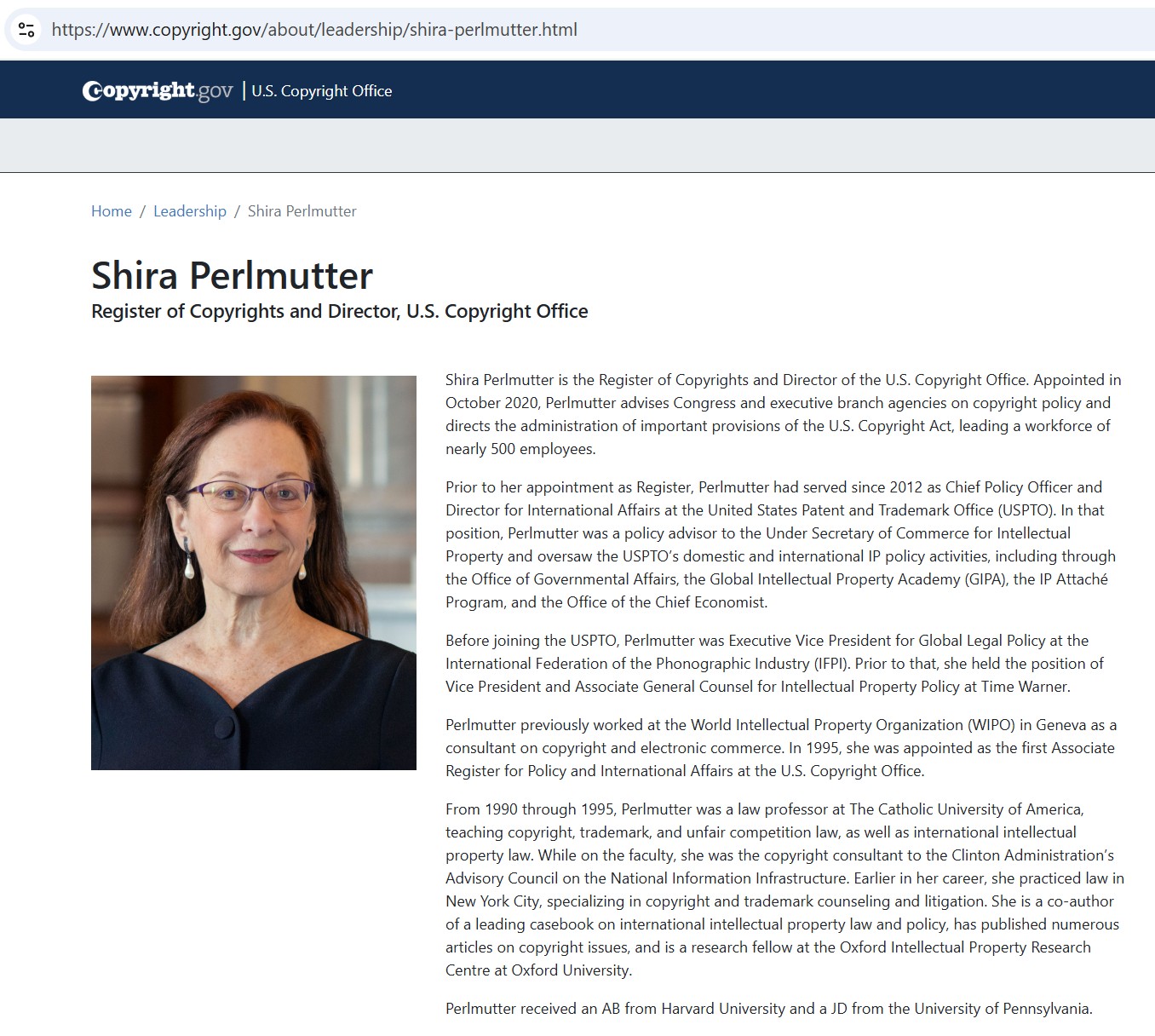 As I just mentioned, the current Register of Copyrights is Shira Perlmutter. Ms Perlmutter is an attorney and law professor with an extensive and impressive background in intellectual property law in both government and the private sector. You know that Shira Perlmutter is the Register of Copyrights, because the official government site for the Copyright Office clearly says so on its “Leadership” page:[9]