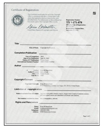 Note that there is no explicit requirement in the statutory language that a signature is required for a certificate to be valid. However, there could conceivably be challenges to the validity of a work’s copyright if the certificate isn’t signed, since the signature is taken as confirming that the Registrar has performed their statutorily-required review and determination.[23]