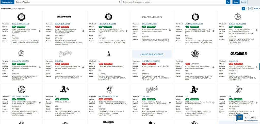 Interestingly, though, previous USPTOs were not so picky about the Athletics: “Oakland Athletics” was successfully trademarked from 1968 to 2024, as were the team’s previous incarnations as the “Philadelphia Athletics” (1901–1954) and “Kansas City Athletics” (1955–1967).