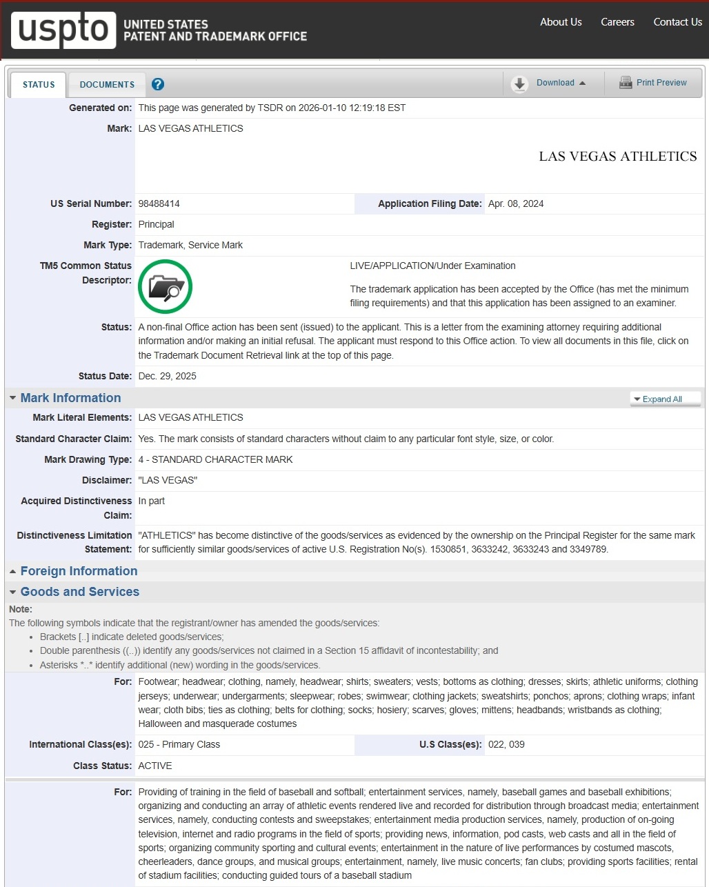 [1] The basic facts about the Oakland application and its rejection are drawn from “Las Vegas A’s trademark denied — is it a ‘big deal’ or ‘workable problem’?”, Howard Stutz (Nevada Independent, January 9th, 2026 (https://thenevadaindependent.com/article/las-vegas-as-trademark-denied-is-it-a-big-deal-or-workable-problem)